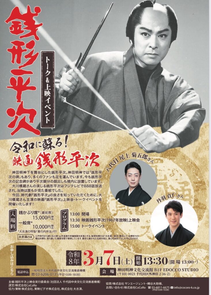 本イベントは、神田明神下を舞台に長年親しまれてきた名作『銭形平次』の魅力を、令和の時代に改めて伝えることを目的に開催。会場では、大川橋蔵さん主演による1967年放映の映画上映に加え、八代目 尾上菊五郎さん、丹羽貞仁さんによるトークイベントも行われ、多くの来場者で賑わった。